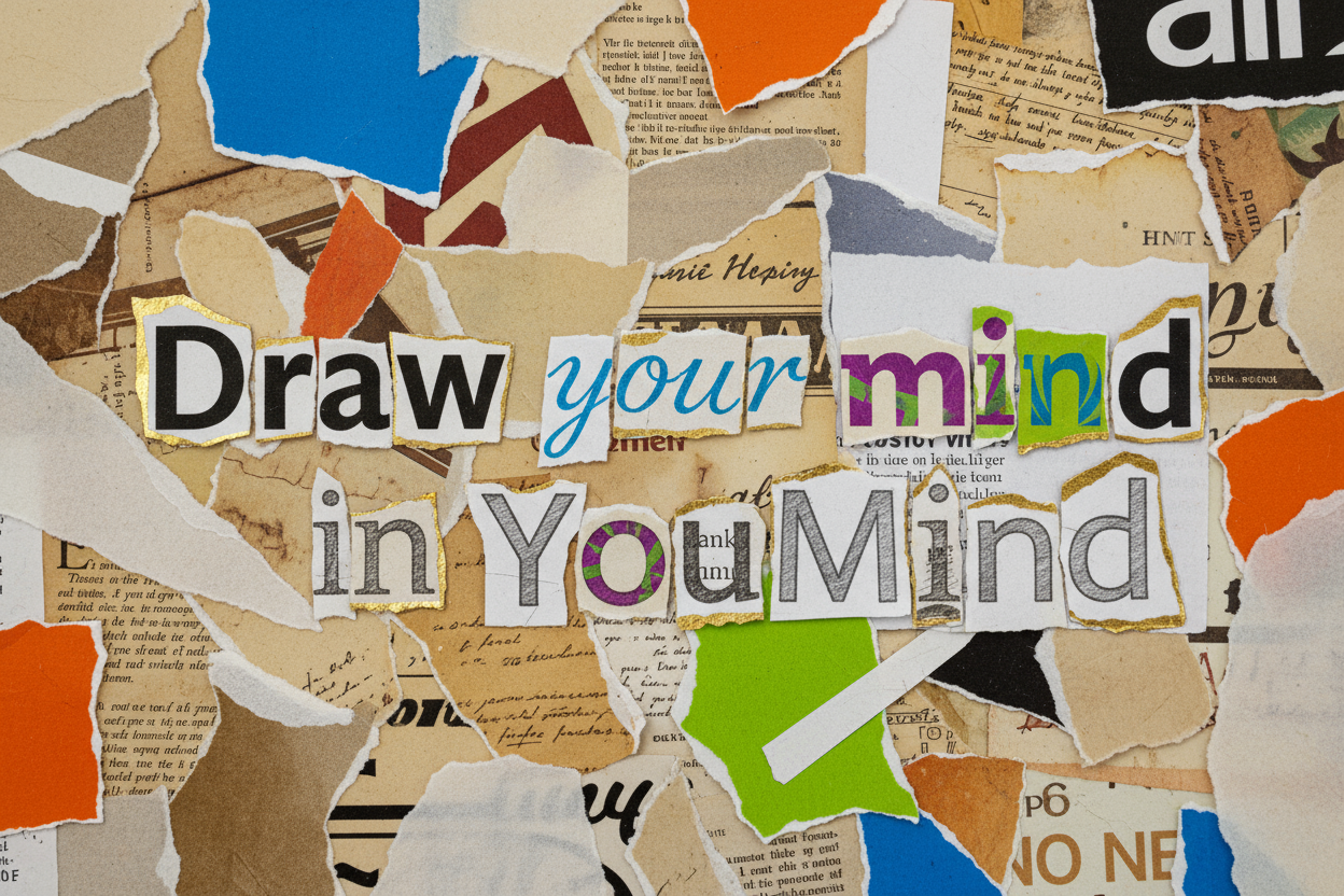 - 聚焦:不同的纸张碎片拼接在一起,有几个单词刚好拼接成一句话