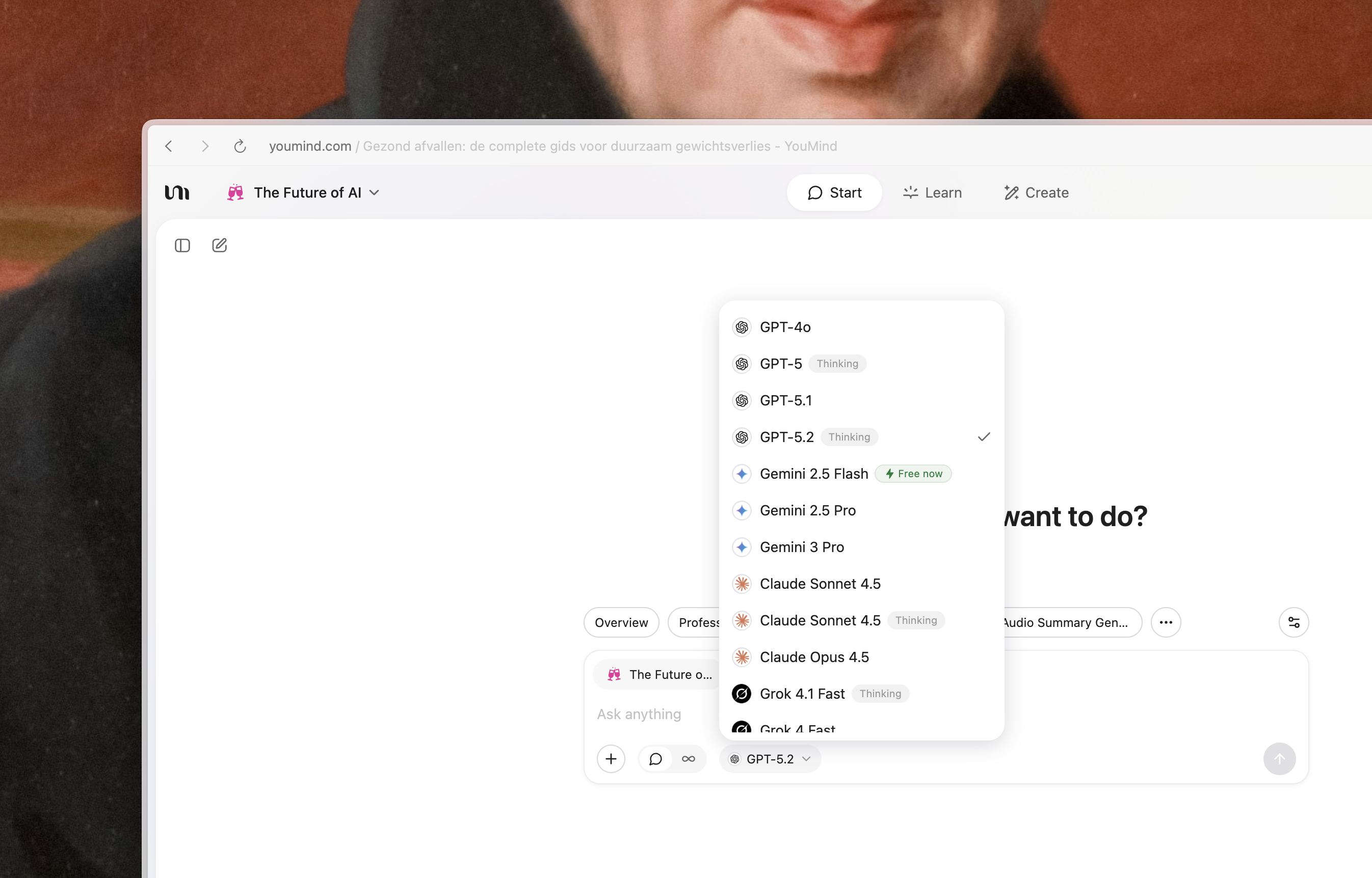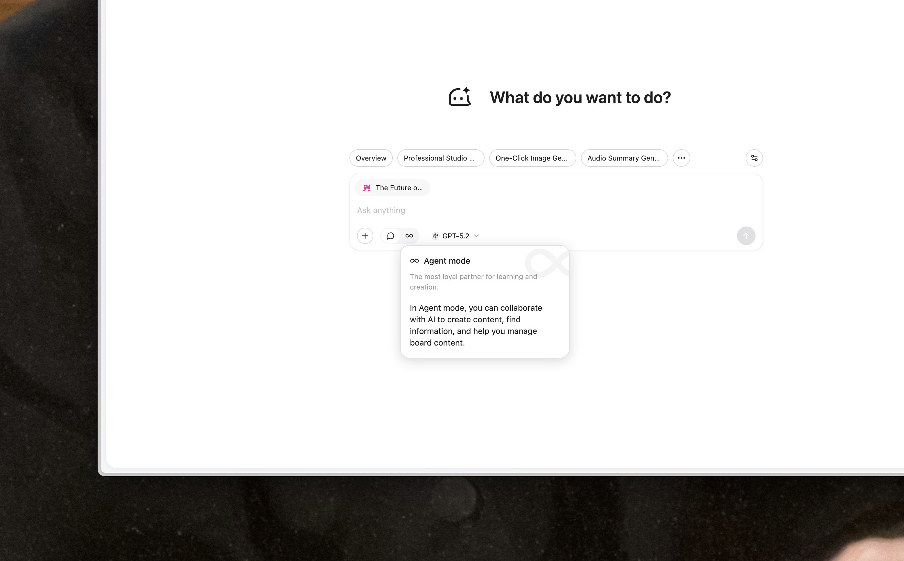 เรายังได้อัปเกรดประสบการณ์การแชทด้วยสองโหมด ได้แก่ Ask และ Agent โหมด Ask ใกล้เคียงกับประสบการณ์การแชทที่สะอาดตา และคุณสามารถสัมผัสได้โดยตรงว่าโมเดลล่าสุดสามารถทำอะไรได้บ้าง รวมถึงตัวเลือก GPT 5.2 ใหม่ เมื่อคุณเปลี่ยนไปใช้ Agent YouMind จะกลายเป็นเหมือนคู่คิดและคู่สร้างสรรค์ที่อยู่กับคุณผ่านการอ่าน การเรียนรู้ และการเขียน และช่วยให้คุณก้าวไปข้างหน้าได้ เราหวังว่ามันจะนำพลังงานมาให้คุณมากขึ้น
