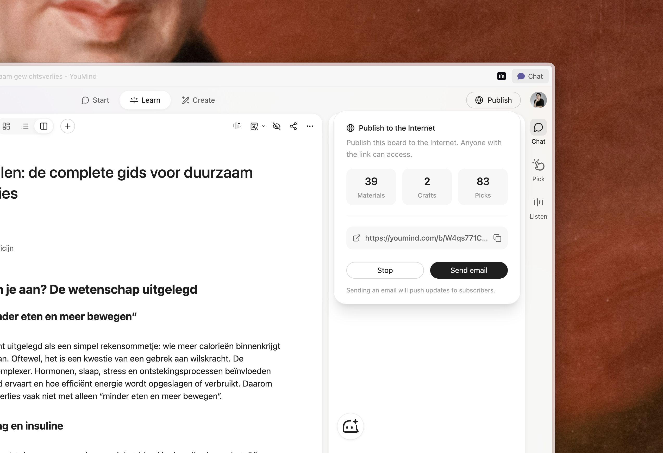 ดังนั้นเราจึงสร้าง Board Publish หลังจากที่คุณเตรียมทุกอย่างใน Board เสร็จแล้ว คุณสามารถคลิก Publish และ YouMind จะสร้างหน้าแชร์แบบสแตนด์อโลน คุณสามารถแชร์สิ่งที่คุณสร้าง Picks ที่คุณจัดระเบียบ และเนื้อหาที่คุณรวบรวม