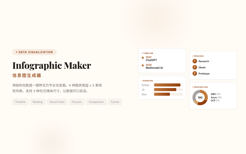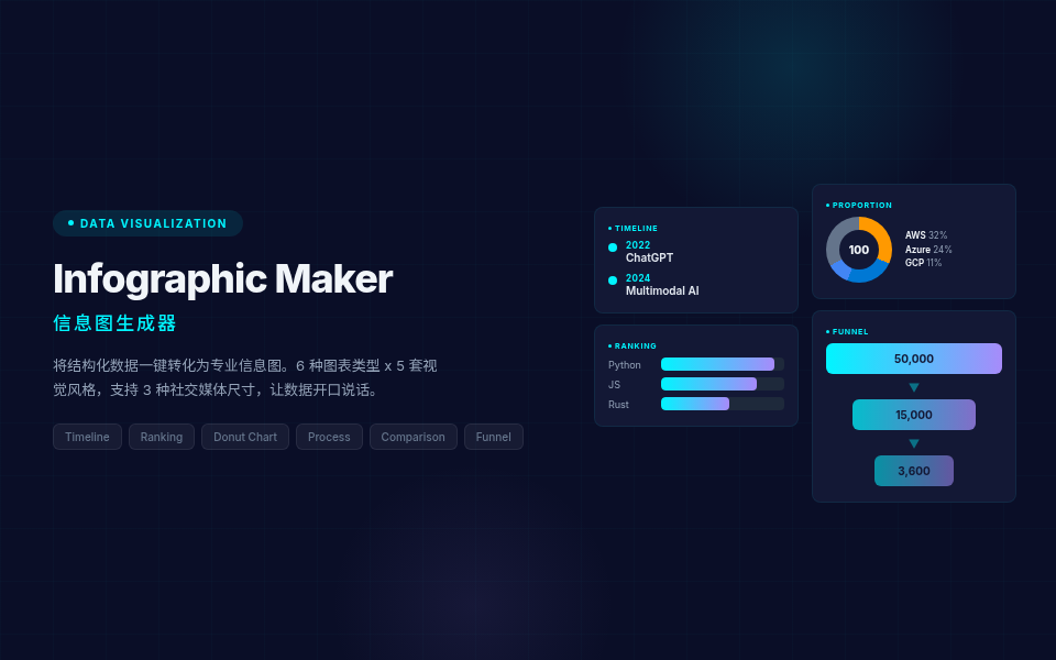 İnfografik Oluşturucu 就能一键生成高品质信息图 PNG。内置 6大图表类型(时间线、流程图、排行榜、比例图、对比图、漏斗图)ve 5 套精心调校的视觉风格(商务蓝、创意彩、暗黑科技、典雅暖、极简黑白),轻松覆盖从年度汇报到社交媒体的所有场景。支持Instagram Hikayeleri (9:16), Feed (4:5) ve Hikayeler (1:1) 三种尺寸,让你的数据自己开口说话。