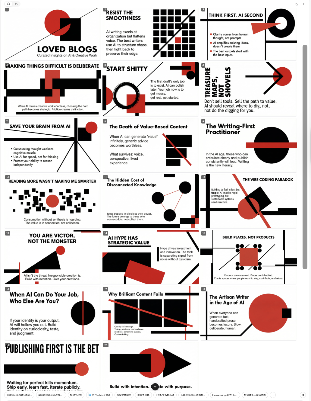 Panomdaki içeriklere dayanarak 20 slayttan oluşan bir PowerPoint sunum broşürü oluşturun. Gereksinimler: Görselleri düzenlere uyacak şekilde otomatik olarak kırpın, her içerik için "ana fikri" çıkarın. Tasarım stili: Bauhaus—geometrik şekiller, siyah/beyaz/kırmızı palet, sans-serif yazı tipi.