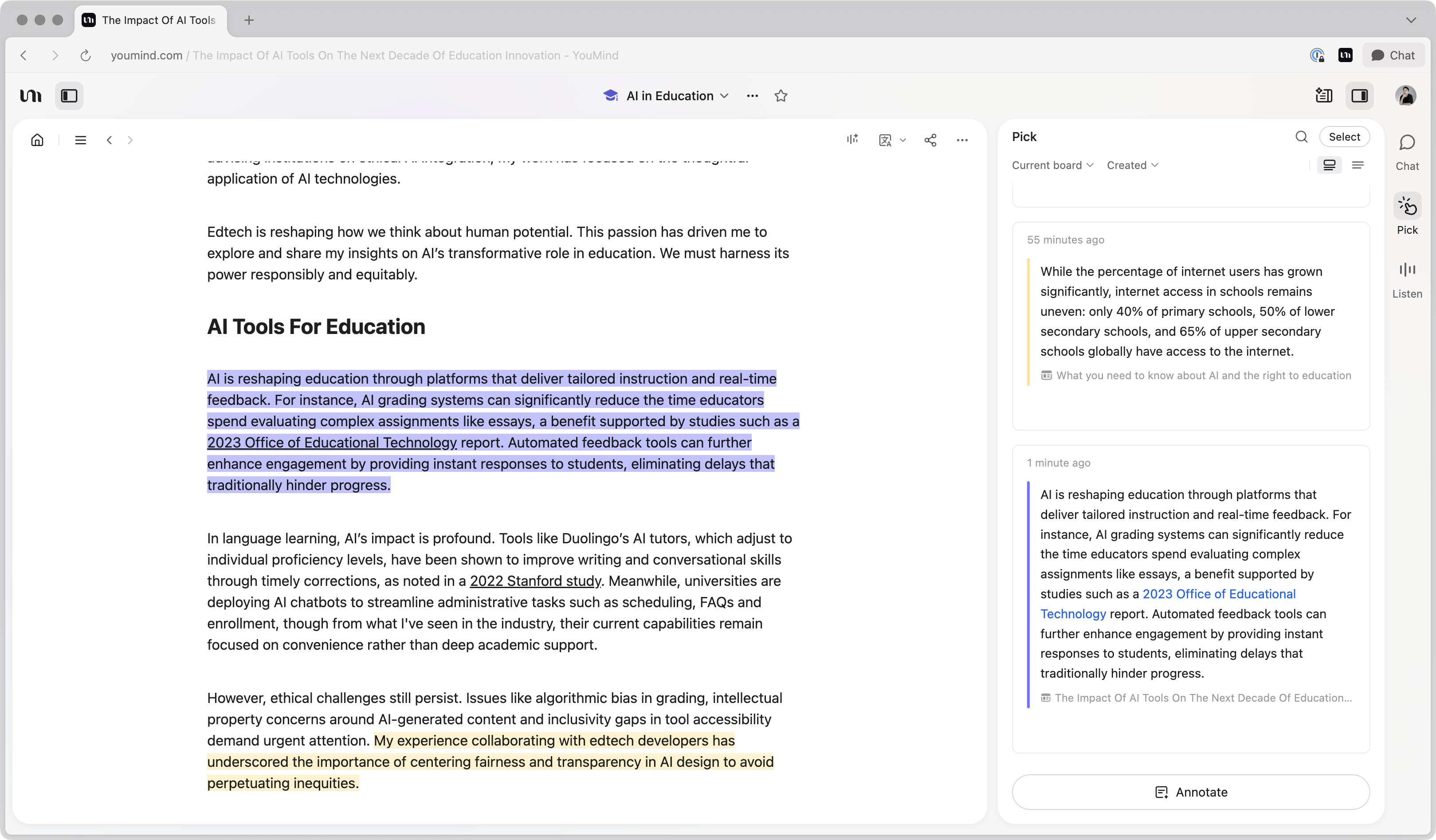 We’ve strengthened Pick. While reading, you can highlight key passages and add inline annotations. New: Merge. Combine selected Picks into a single Note in one click—whether it’s one item or many—so organizing your materials stays quick and low‑friction.