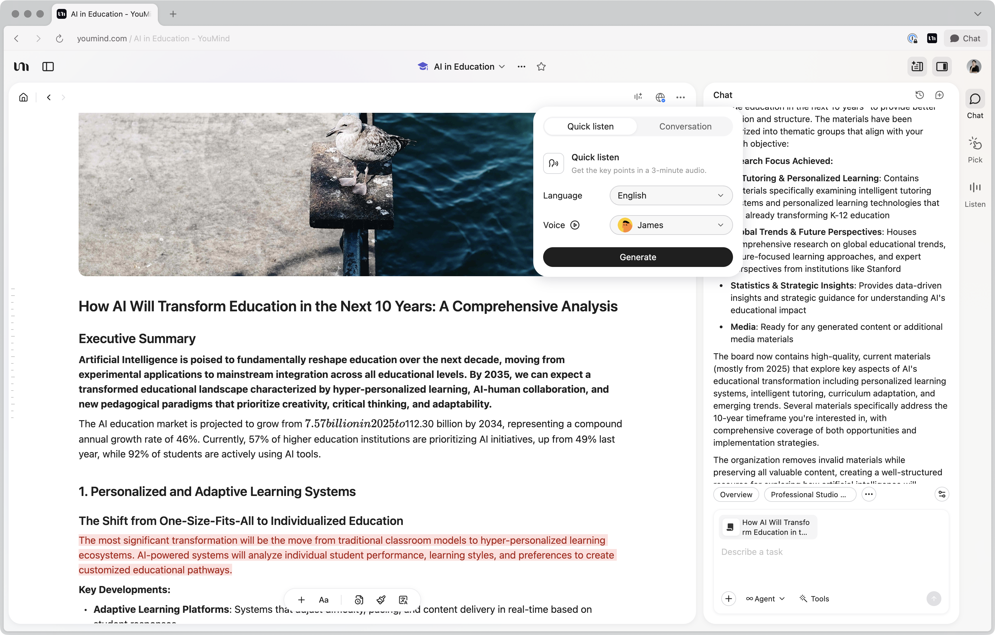 Pages now support Sharing and Audio. Copy a share link for any Page to give others instant access. You can also generate Audio in one click: a 3‑minute quick listen or a more conversational format. Pairing text with audio makes your work richer and easier to share.