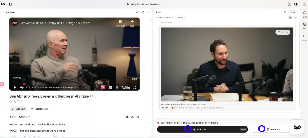 Pick | Highlights & annotations you marked on any material | Throughout your entire workflow | Mark what resonates, review your interest patterns, cite sources in your creations with proper attribution |