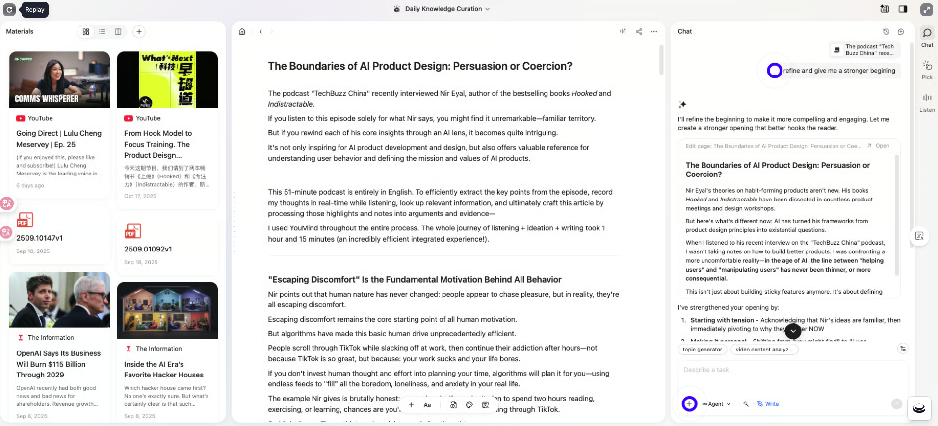 You found a strong podcast interview and want to publish takeaways with your stance and phrasing. Personalize YouMind agents to research, script, and repurpose so you publish faster without losing your tone.