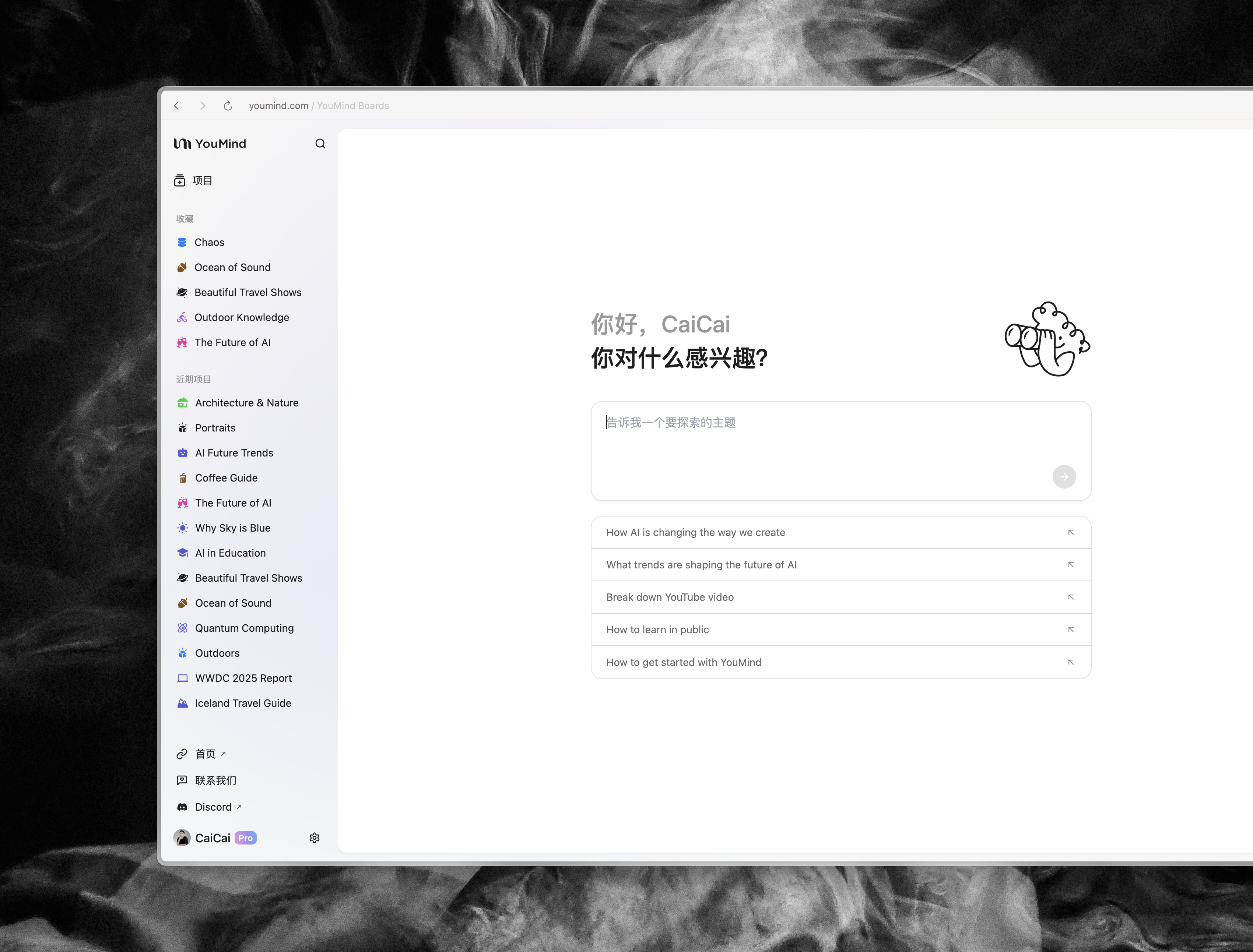 从今天开始,YouMind 正式支持中文界面。下面为你介绍几个最重要的功能,帮助你快速上手。