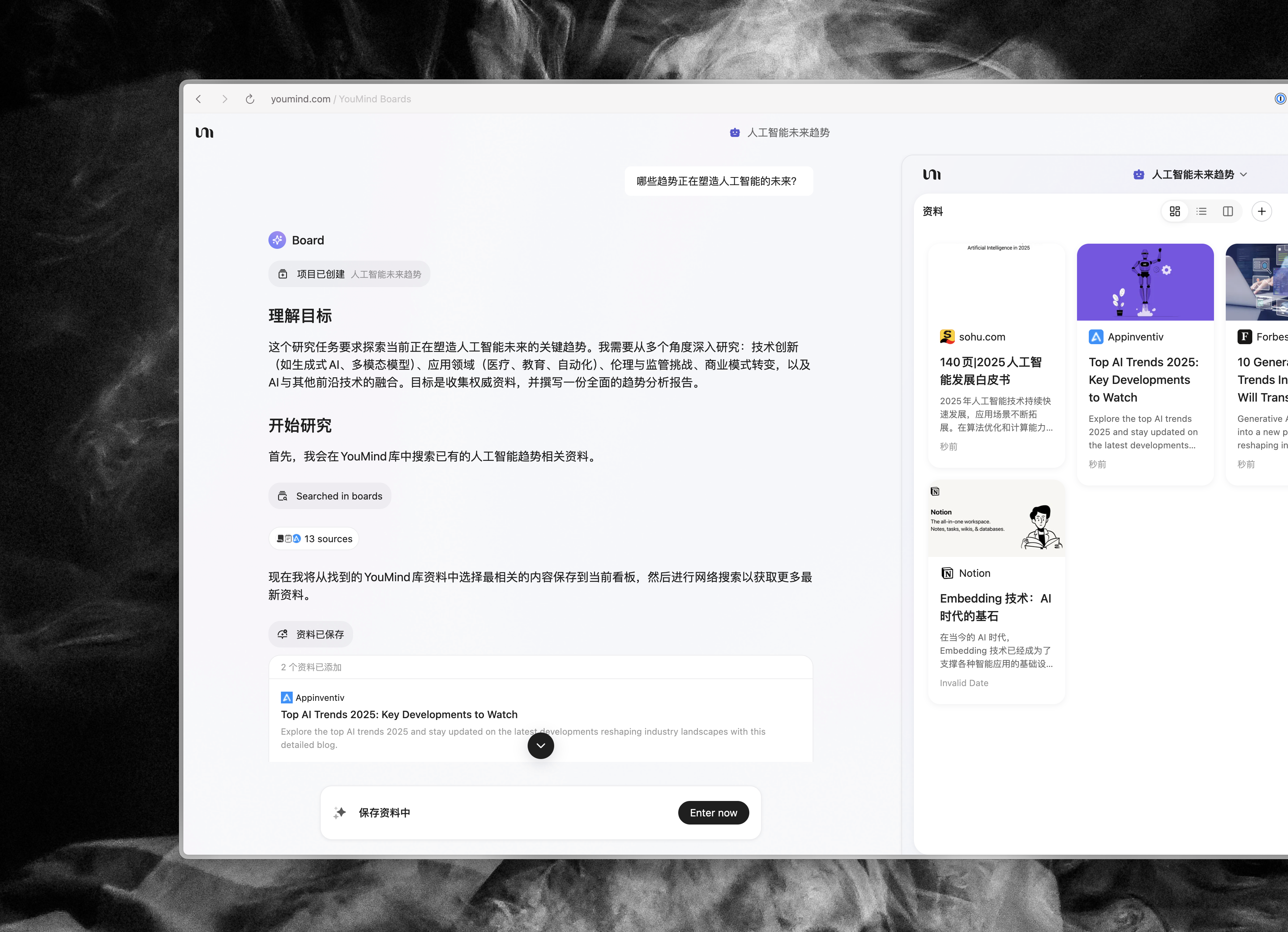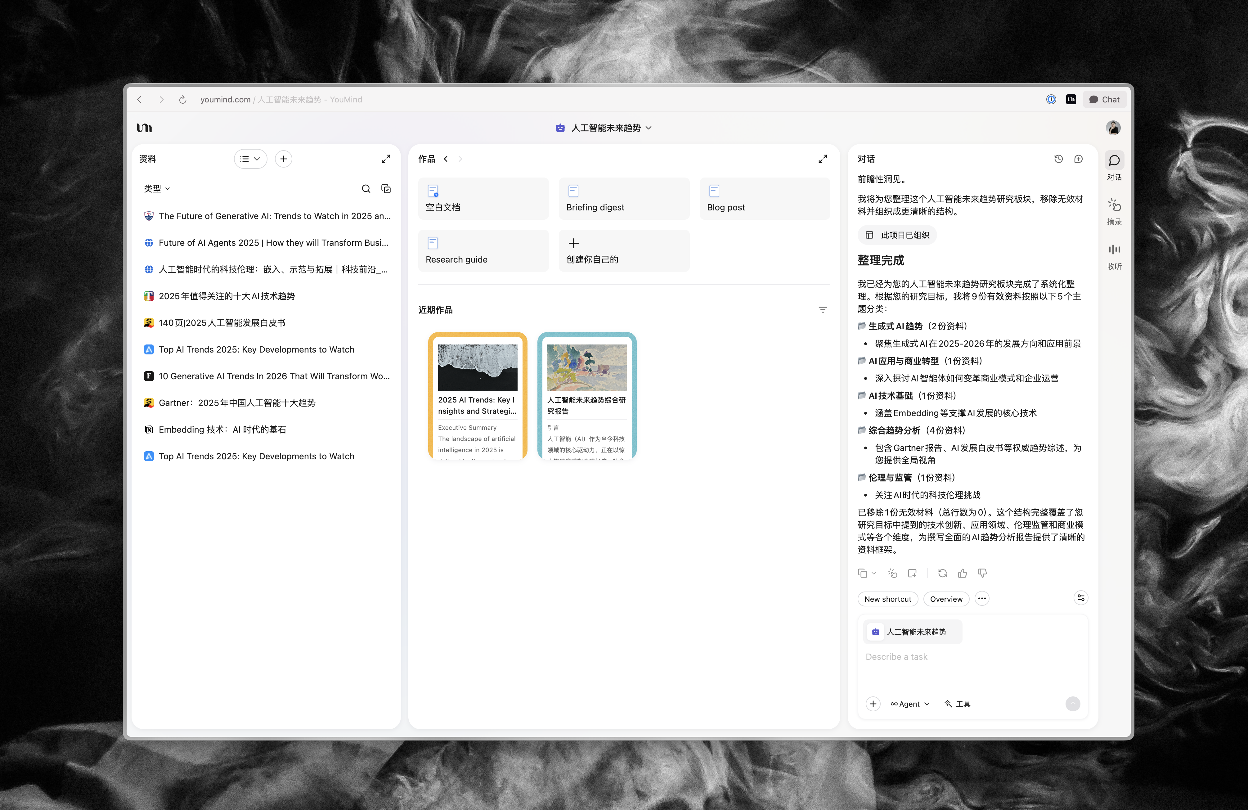 我们做 YouMind 的初心很简单:让学习和创作不再是一个独自面对的时刻,而是一个自然流动的过程。工具应该懂你,陪你一起成长。我们会持续打磨产品,让你可以专注于真正重要的事情——学习、思考、创作。