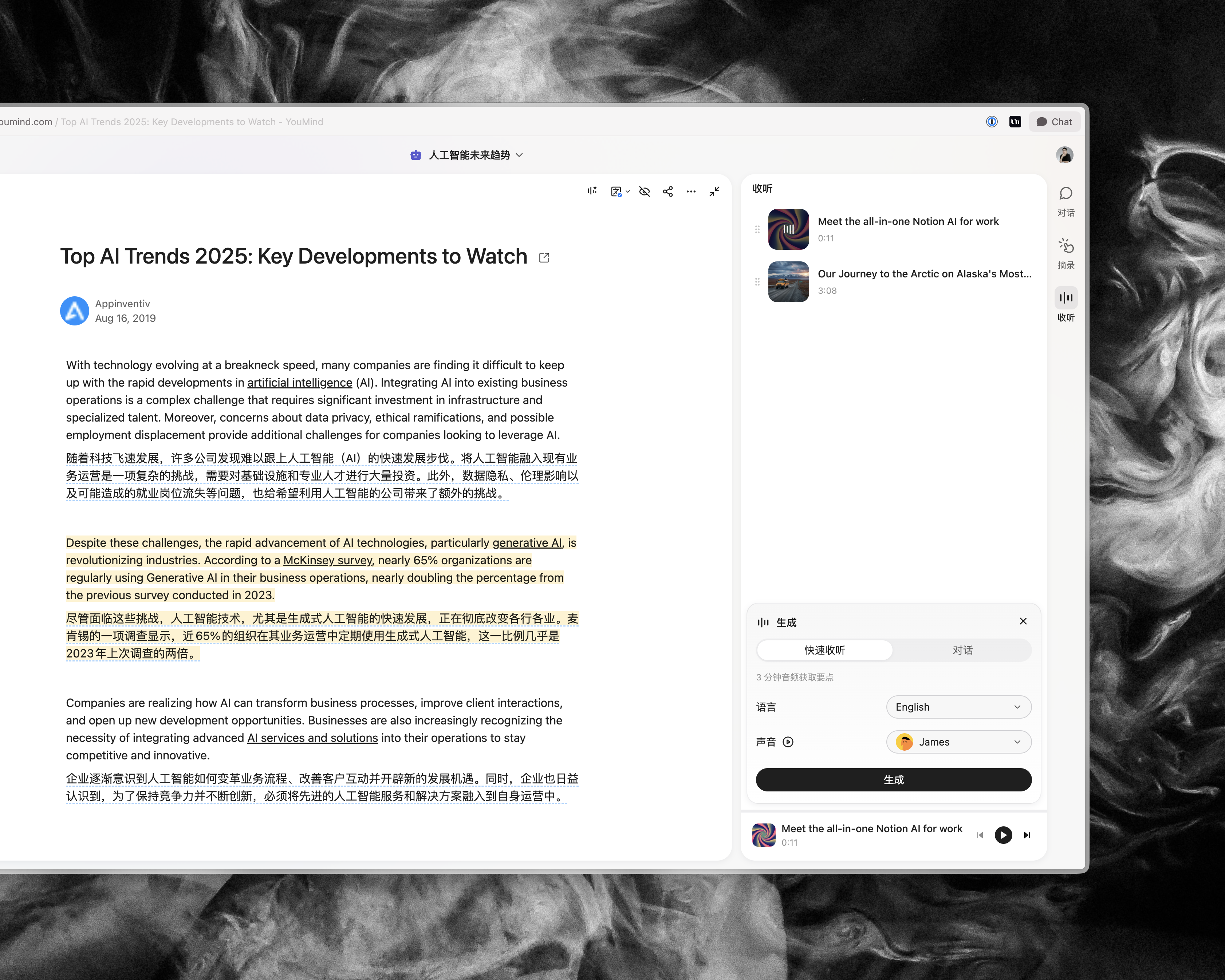 “收听” 是一个将内容转化为音频的功能,让学习可以发生在任何场景。你可以选择三分钟速听来快速掌握长内容的核心要点,也可以选择对话音频这种更自然的对话形式来深度理解内容。项目中的任何材料、你创作的文档和笔记、YouTube 视频和 Podcast 都可以生成音频。在通勤路上、散步时、做家务时,你都可以用 “收听” 持续学习。