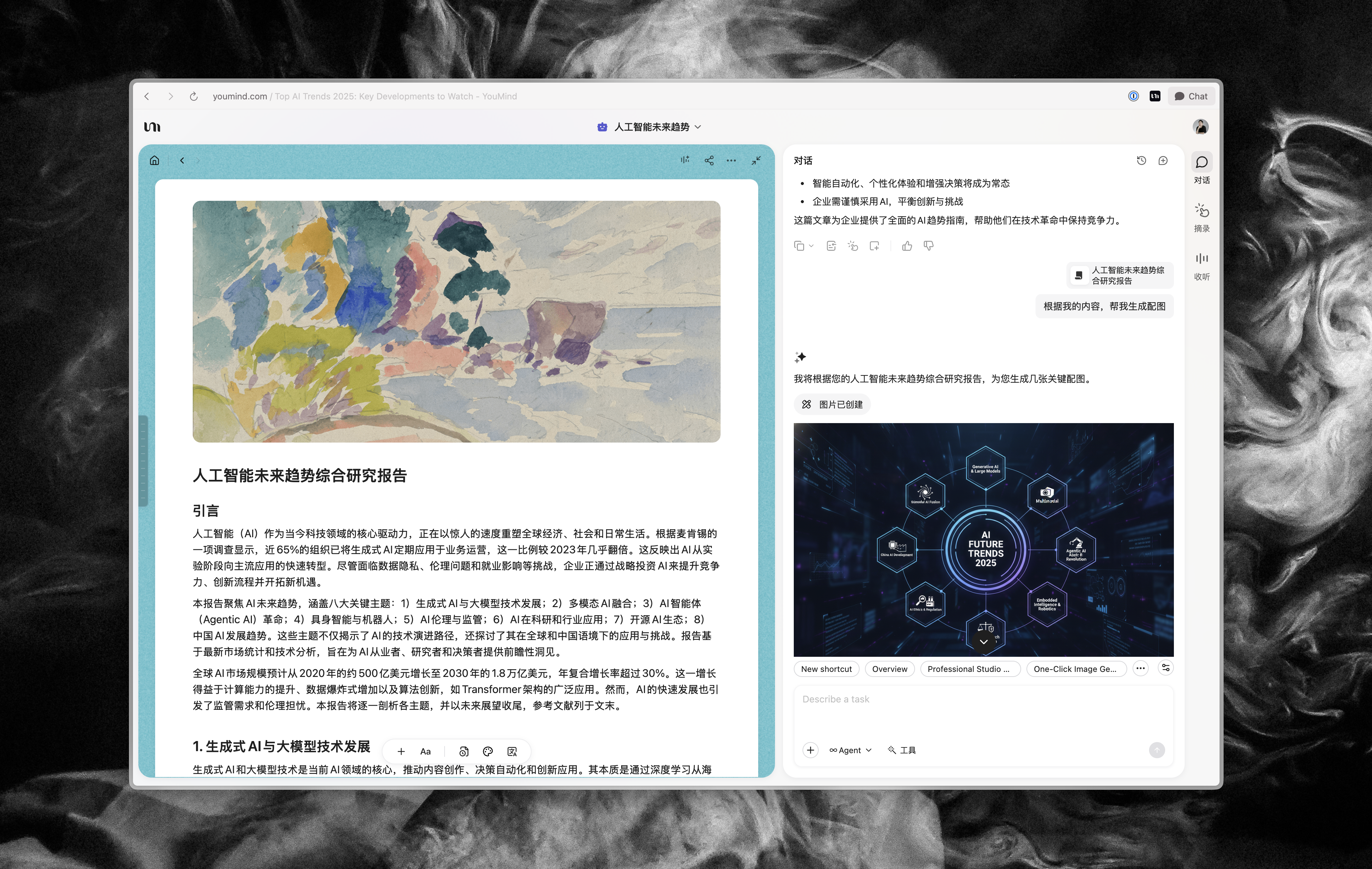 YouMind 是学习与创作相遇的地方。从保存资料到获得答案,从灵感闪现到完成作品,一切都在一个连贯的空间里自然流动。你可以和 AI 一起学习、思考、创作,无需在多个工具之间切换。