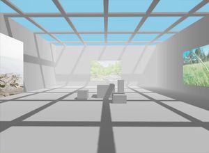 一个英文提示,指示 Gemini 使用 three.js 创建一个可步行的 3D 博物馆场景,该场景具有白色墙壁和地板、玻璃天花板以及大厅中的方块,就像一个小型第一人称网页游戏环境。