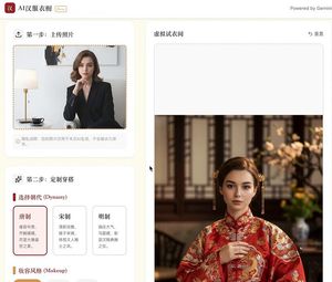 一个用于 Gemini 3 Pro 的中文提示,旨在生成一个汉服衣橱网络应用。用户可以在该应用中上传照片,虚拟试穿不同朝代的服装,并自定义发簪和妆容。
