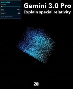 一个简洁的 Three.js/GLSL 提示,要求 Gemini 3 Pro 创建一个光线步进的 Mandelbulb 分形,周围环绕着数千个音频响应的实例化粒子,并带有 Unreal Bloom 效果,所有这些都在一个文件中实现。