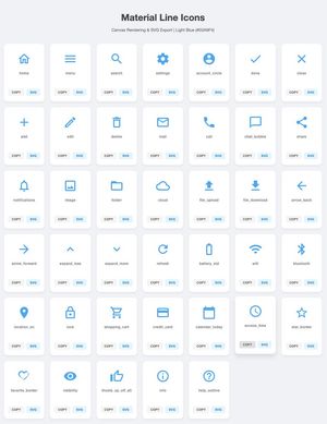 一个日文提示,要求 Gemini 生成 40 个浅蓝色线条风格的简单、多功能 SVG 图标,并为每个图标提供下载按钮。