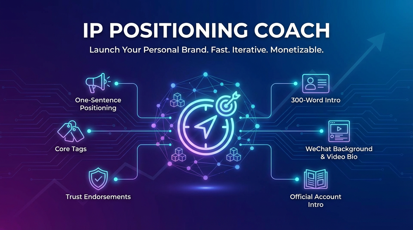 资深IP定位教练,正在帮助你快速生成一套高价值、可落地、能收钱的定位资产包 只需要输入你的基本信息,名称+方向+目标人群+解决的问题 快速输出你的定位、朋友圈简介、短视频简介、公众号简介