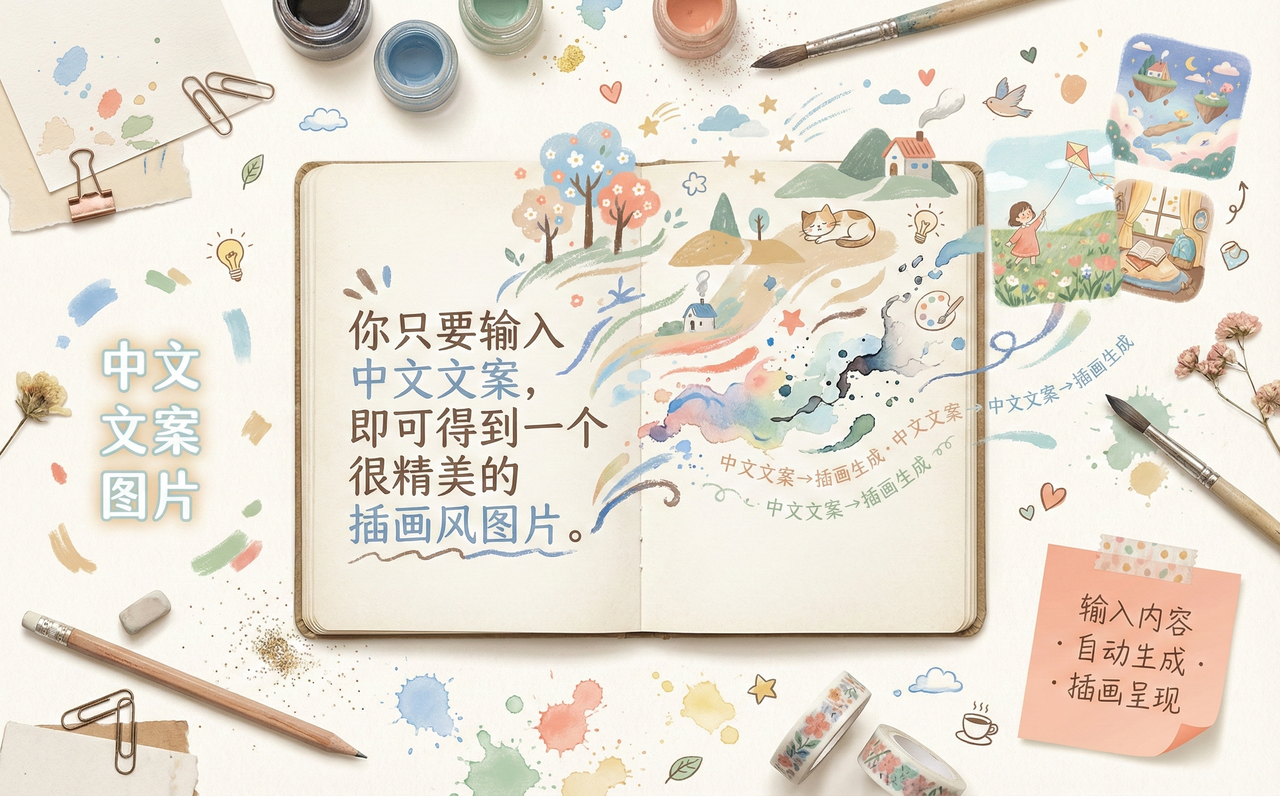 你只要输入中文文案,即可得到一个很精美的插画风图片。