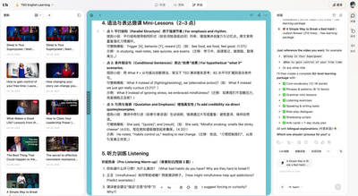 将任何TED演讲转化为个性化英语学习课程。系统拆解核心词汇、语法和表达,提供听、说、读、写全方位练习,助你高效精进。